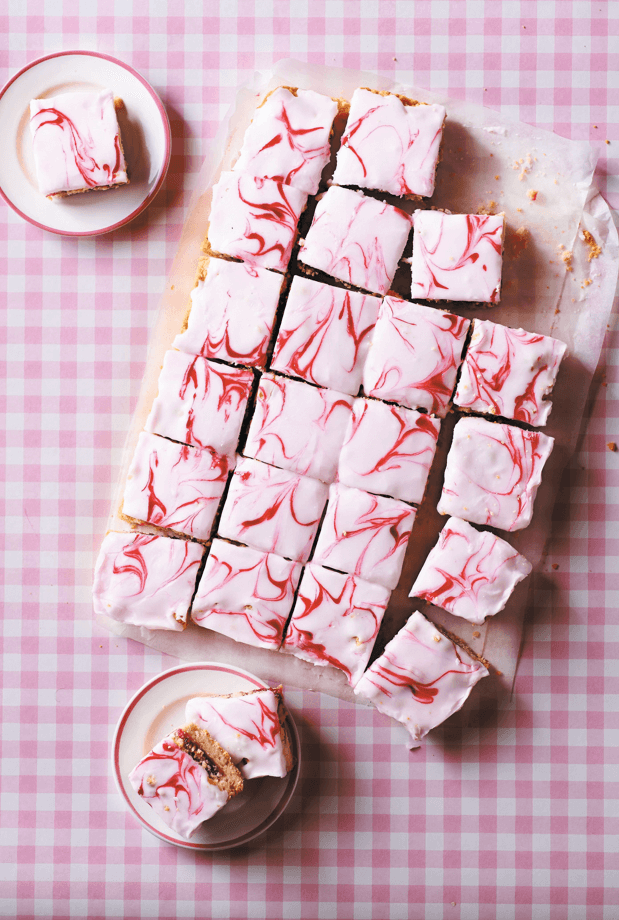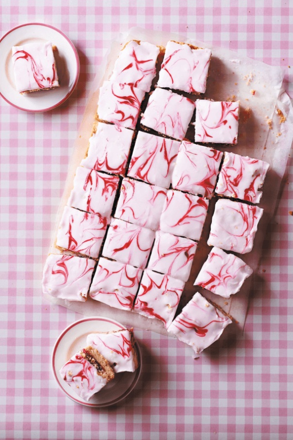 Ko se pecivo ohladi, sladkor v prahu presejemo v skledico in ga s približno 1 dl vode in malce rožnate barve za živila razmešamo v gostljato, a še nekoliko tekočo zmes. Prelijemo jo po testu, nato model potresemo, da se enakomerno razlije po vsej površini. Na glazuro tu in tam na hitro kanemo kapljo dodatne rožnate barve, nato pa z zobotrebcem zarišemo po glazuri marmoriran vzorec. Pustimo čez noč, da se glazura strdi, nato pecivo razrežemo na rezine. V zaprti posodi se bodo ohranile pet dni.