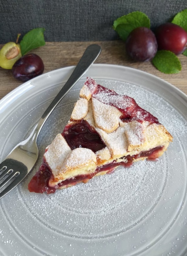 Slivova pita z medom in rdečim vinom je sočna, sladko- kisla in osvežilna sladica za pozno poletne dni.