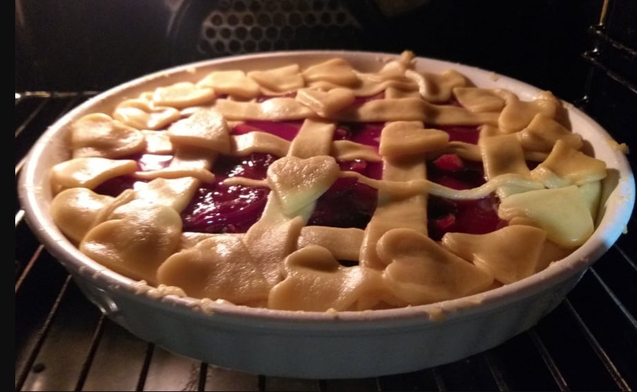 Preostalo testo razvaljamo in iz njega oblikujemo trakove in druge oblike. pito zgoraj okrasimo. Priporočam vam, da ne pokrivate celotne pite s testom saj nadev potrebuje nekaj odprtega prostora za vretje v pečici.