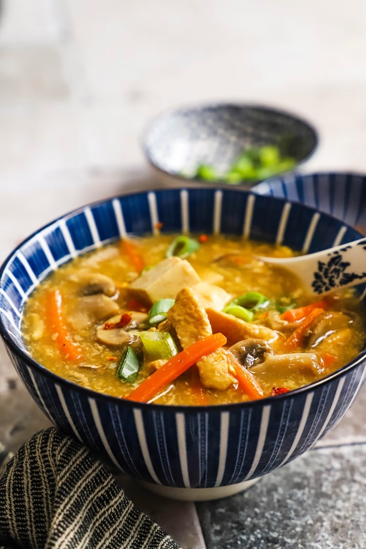 Ta juha je še boljša kot tista iz kitajske restavracije! Je čudovito svilnata, polna zelenjave (gobe, korenje, mlada čebula) in proteinov (piščanec, tofu, gobe in jajca) ter ravno prav pekoča in kisla. Juha se čudovito pogreje in je dobra tudi do 5 dni, zato je lahko več pripraviš tudi za vnaprej.