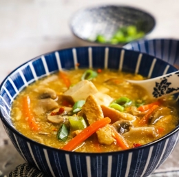 1,5 l piščančje jušne osnove (ali vode in jušne kocke) 3 žlice sojine omake 1 žlička svežega naribanega ingverja (ali 1/2 žličke sušenega) 1 strok naribanega svežega česna (ali 1/2 žličke sušenega) 1 žlička sezamovega olja 1/2 žličke sladkorja 1/2 žličke (belega) popra 1/2 žličke čilijevih kosmičev 200 g piščančjega fileja Natur Premium Perutnine Ptuj 150 g gob 1 korenje 1 velika žlica sušenih gob 150 g tofuja 65 ml jabolčnega kisa (ali riževega kisa) 40 g gustina + 125 ml vode 2 jajci 1 mlada čebula