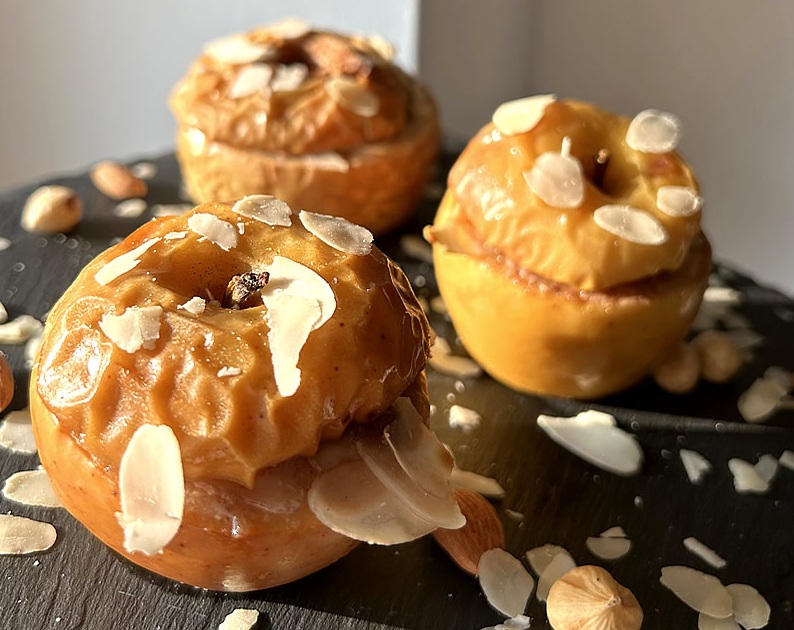 V vsako jabolko damo košček masla ter nadevamo z nadevom, po vrhu posujemo z vaniljevim sladkorjem ter mandljevimi lističi in postavimo v pečico za 20 minut na 180 stopinj Celzija.