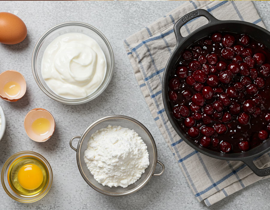 300–400 g višnjevega kompota 4 jajca 8 žlic sladkorja 16 žlic jogurta 16 žlic moke 14 žlic olja 1 pecilni prašek Sladkor v prahu za posip