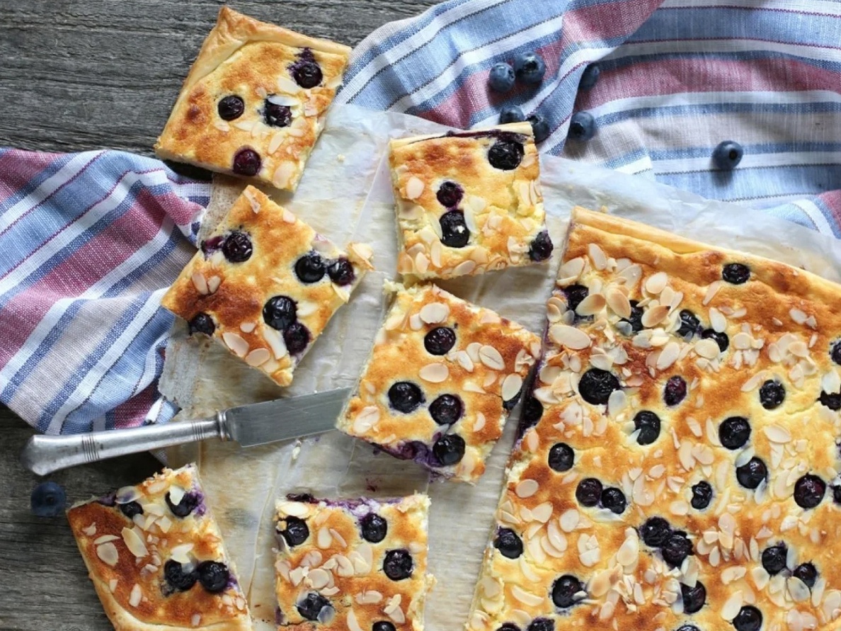 - 2 beljaka - vrečka vaniljevega sladkorja - zavitek listnatega testa - 0,5 dl sladke smetane - 250 g pasirane skute - 2 rumenjaka - 3–4 žlice sladkorja v prahu - ameriške borovnice (lahko tudi maline, robide ...) - nalistani mandlji