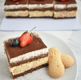 Sledi druga polovica kreme in biskvit, katerega spet namočimo z mlekom. Na vrh namažemo stepeno sladko smetano, katero smo sladkali po okusu. Sledi le še kakav za posip.