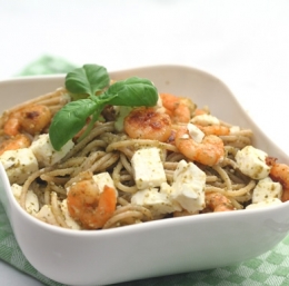 400 g špagetov, 200 g sira Feta, 2 stroka česna, 12 velikih kozic, 50 g bazilike, 30 g pinij, 1 strok česna, 30 g sira Pecorino (naribanega; ali drugi poltrdi sir), 1 čajna žlička olivnega olja.