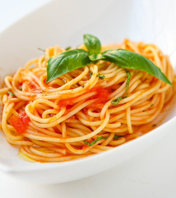 Potem dodamo sladkor, malo rožmarina, premešamo in kuhamo, da se omaka malo zgosti. Na koncu dodamo še malo bazilike, praženo slanino in sesekljan svež peteršilj. Špagete skuhamo v osoljeni vodi in ponudimo z omako.