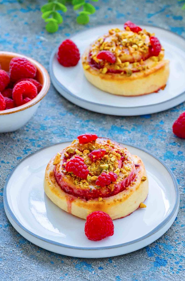 Malinove rolice s pistacijami so odlična alternativa priljubljenim cimetovim rolicam. Mehko testo skriva aromatičen nadev iz malin, kardamoma in limone. Za piko na i poskrbijo hrustljave pistacije.