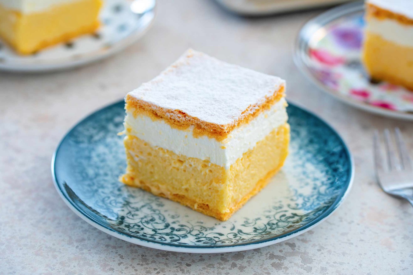 Kremne rezine posujemo s sladkorjem v prahu, jih razrežemo in postrežemo.