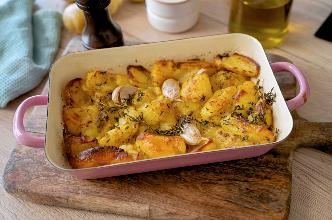 Pečen krompir v pečici je nekaj tako preprostega, ampak vedno je lahko malce boljši. Tale različica je odišavljena s svežimi vejicami timijana, lahko pa dodamo rožmarin, lovorjeve liste ali recimo žajbelj.