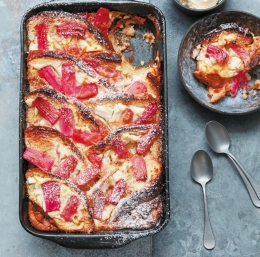 400 g rabarbare 150 g svetlo rjavega sladkorja 3 dl polnomastnega mleka 3 dl sladke smetane ščepec soli 1⁄2 žličke vaniljeve arome 3 velika jajca 1 rumenjak pribl. 250 g kruha (mehkih belih žemelj, kruhovih rezin ali briošev) 35 g masla 200 g albuminske skute (rikote) 25 g sladkorja v prahu nastrgana lupina 1 limone nastrgana lupina 1 pomaranče crème fraîche ali sladka smetana in grški jogurt, ko postrežemo sladkor v prahu za posip