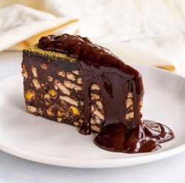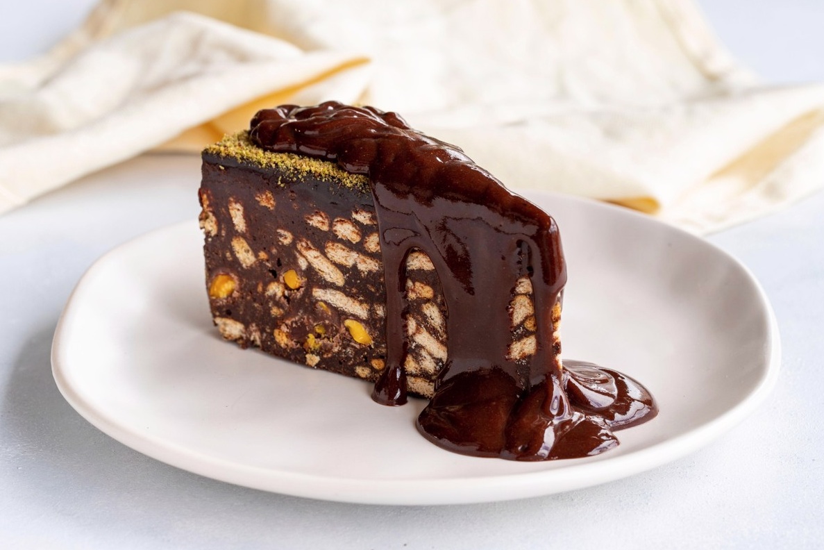 Kekse zdrobimo, a ne preveč na drobno. Damo jih v skledo in prelijemo s čokoladno omako, dodamo še pistacije in orehe; z lopatko ali leseno kuhalnico rahlo mešamo, da se vse sestavine lepo povežejo in so keksi obdani s čokoladno zmesjo.