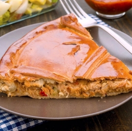 Segrejemo olje in zelenjavo prepražimo, dodamo sol in poper, premešamo, potem dodamo tunino in ponovno premešamo. Okrogel pekač rahlo namastimo, dno obložimo s polovico testa. Dodamo mešanico tune in zelenjave, pokrijemo z drugo polovico testa in robove dobro stisnemo.