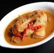 6 piščančjih beder (lahko tudi brez kosti) 1 čajno žlico škampove paste 1 zvrhano malo žlico kurkume 2 srednje veliki čebuli 4 stroke česna 2 jušni žlici tamarind omake 1 rdeč čili ali žličko paste sambal oelek 2 dl kokosovega mleka 1 dl kokosove smetane 3 žlice arašidovega olja
