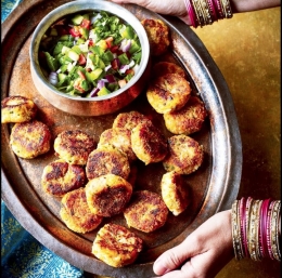 800 g sladkega krompirja 4 cm dolg kos ingverja prgišče koriandra 1⁄2 žličke grobo mletega črnega popra 1⁄4 žličke sušenih čilijevih kosmičev (ali malo več za pikantnejši okus) 1 1⁄2 žličke grobo mletih semen kumina (orientalske kumine) 2 žlici koruznega škroba 100 g krušnih drobtin sol rastlinsko olje za cvrenje solata kačumber 1 srednje velik paradižnik 1⁄2 kumare 1 majhna zelena paprika 1 majhna rdeča čebula sok 1⁄2 limete morska sol prgišče narezanega koriandra