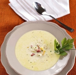 5 dl vode 5 poprovih zrn 5 nageljnovih žbic nekaj žafranovih nitk 2 lističa žajblja malo luštreka, ingverja, bazilike, pehtrana in timijana za povezavo juhe 1,25 dl kisle smetane 2 rumenjaka 1 žlica moke