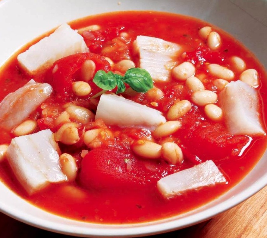 400 g trske 1 čebula 4 žlice oljčnega olja 300 g olupljenih paradižnikov 300 g kuhanega belega fižola kajenski poper ½ žličke suhega šetraja ali origana sol sveže zmlet črni poper