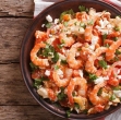 Ribe razrežemo na večje kose, previdno premešamo z ostalimi sestavinami v kozici, po okusu začinimo, pokapamo z oljčnim oljem in postrežemo.