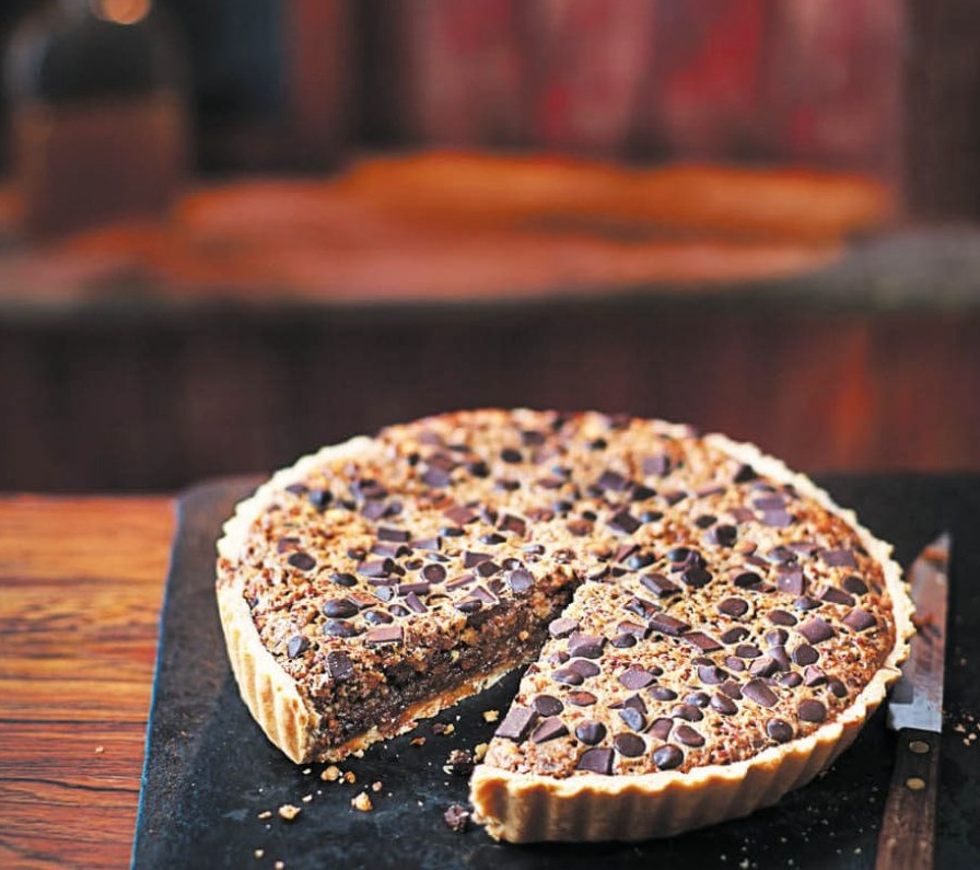 Orehova jedrca drobno sesekljamo. Čokolado narežemo na koščke. V skledi razžvrkljamo jajca. Dodamo jim sirupovo mešanico, vaniljo in orehe ter temeljito razmešamo. Polovico mešanice zlijemo v pečeno testo, jo potresemo s polovico čokoladnih koščkov, prekrijemo s preostalim nadevom in potresemo z drugo polovico čokolade. Postavimo na mrežico na sredini pečice in pečemo 50 do 55 minut, tako da postane nadev čvrst. Nato vzamemo pito iz pečice in jo pustimo, da se ohladi. Preden postrežemo, jo vsaj za 2 uri postavimo v hladilnik.