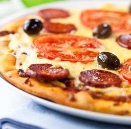 Kvas nadrobite v skodelico, prelijte z malo tople vode in počakajte, da vzhaja. V posodo stresite moko in sol, premešajte, naredite jamico, vanjo vlijte kvasec, malo olja in zgnetite v mehko in gladko testo. Vodo prilivajte po potrebi. Testo vzhajajte v pokriti posodi (pokrijte jo s folijo ali toplo kuhinjsko krpo). Medtem pripravite paradižnikovo omako. Pelate drobno narežite in stresite v kozico, kjer ste že razgreli olje in na hitro prepražili sesekljan česen. Solite po okusu in primešajte še nasekljano baziliko. Omako blago kuhajte okoli 15 minut. Vzhajano testo razdelite na tri kepice, raztegnite in razvaljajte na papirju za peko. Testo premažite s paradižnikovo omako, mocarelo poljubno natrgajte kar z rokami, obložite s salamo in rezinami paradižnika, po želji potresite še z listi bazilike. ;;