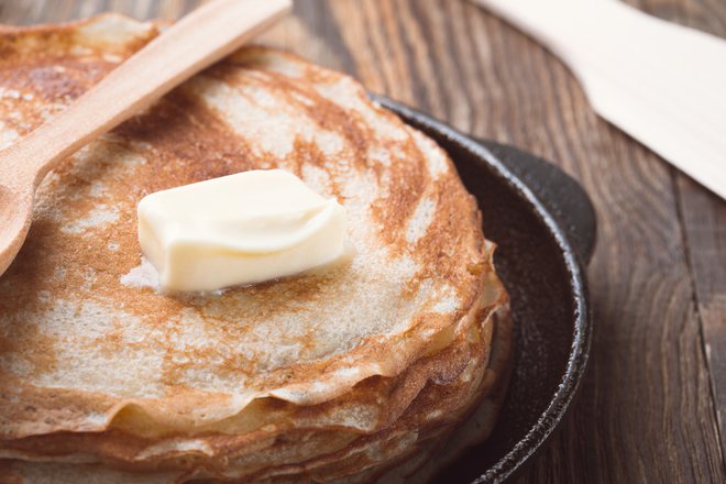 Testo mora biti dovolj redko, da ga lahko s posebno leseno paličico zelo na tanko raztegnemo na litoželezni ponvi. Foto: Shutterstock Od kod izvirajo palačinke?