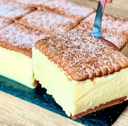 Kekse nadevamo še po vrhu kreme in sladico postavimo v hladilnik za nekaj ur, da se strdi.
