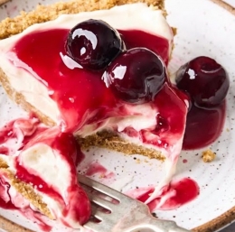 Kremna, osvežilna in preprosta cheesecake torta brez peke, z mehko teksturo in bogatim višnjevim prelivom.