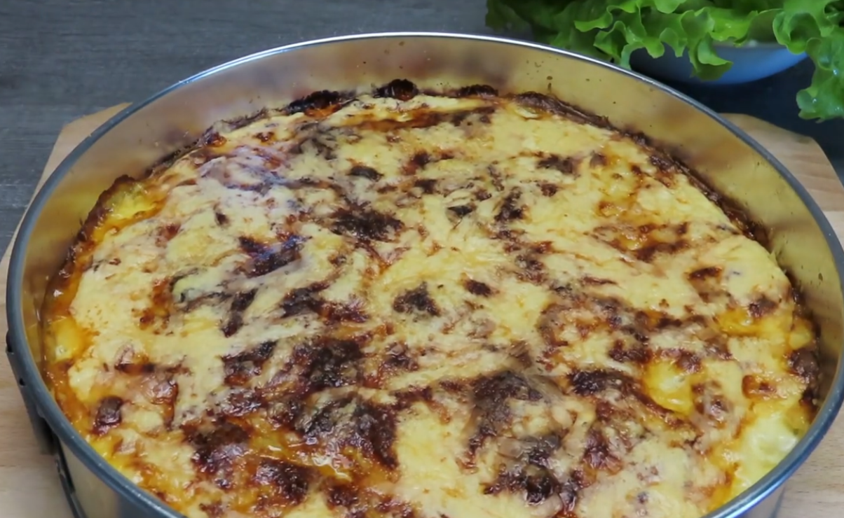 Za dodaten okus potresite s sveže naribanim parmezanom. Pecite v predhodno ogreti pečici 60 minut pri 190 °C, dokler vrh ne postane zlat in mehurčkast.
