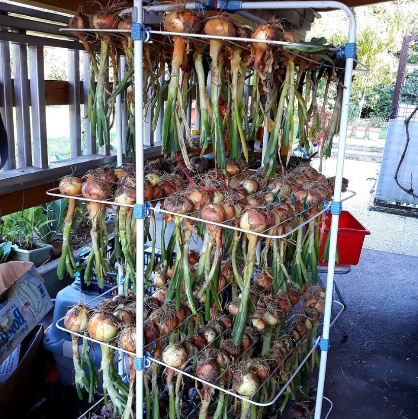 Iznajdljiva vrtičkarica je takole dala sušiti čebulo. Če je zunaj mokro ali preveč sveže, pa je treba zrelo čebulo takoj prestaviti na zaščiteno mesto, da ne začne gniti ali plesniti. Tla garaže ali pokrita veranda sta dober prostor za to.