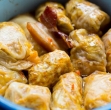 V posodo zlagamo plast zelja, solimo, dodamo nekaj listov lovorja ter nekaj popra in ponovno zelje, sol,lovor, poper …