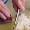 Ramsay najprej čebulo olupi in jo prereže na polovico skozi koreninski del – tako dobimo dve polovici, ki ju je lažje obvladovati.