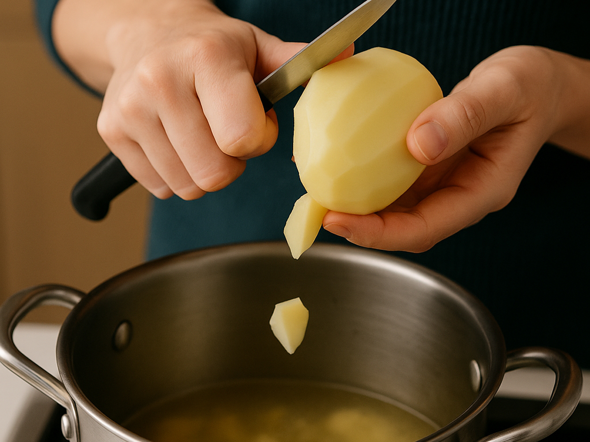 Ta babičin stil je preprost: krompir držite nad loncem ali nad posodo z vodo in ga z nožem režete ter hkrati lomite na nepravilne kose. Ti naj bodo približno enake velikosti, vendar naj imajo nazobčane in tanjše robove. Prav ta nepopolnost je tisto, kar naredi razliko.