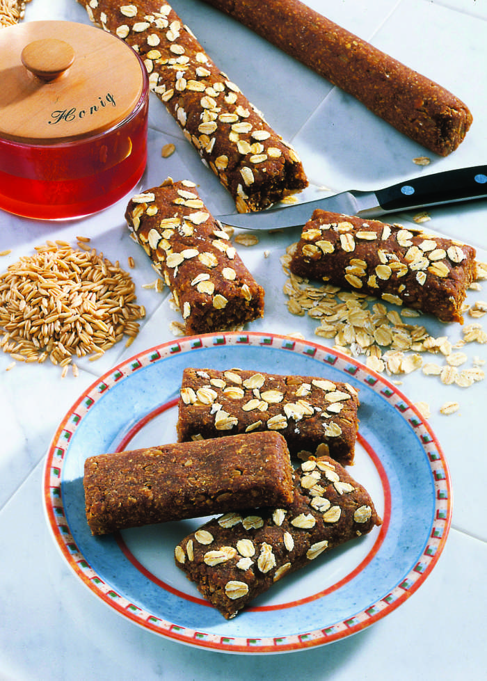 Marelice na drobno zrežemo. Lešnike in kalčke zmešamo s pecilnim praškom, dodamo 150 g kosmičev, med, maščobo in pomarančni sok.