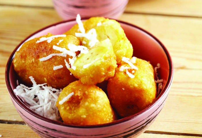 Banane narežite na koščke. V voku ali fritezi segrejte olje za cvrtje na 180 stopinj. Po tri do štiri koščke banane naenkrat potopite v testo, jih rahlo odcedite in nato previdno položite v vroče olje.