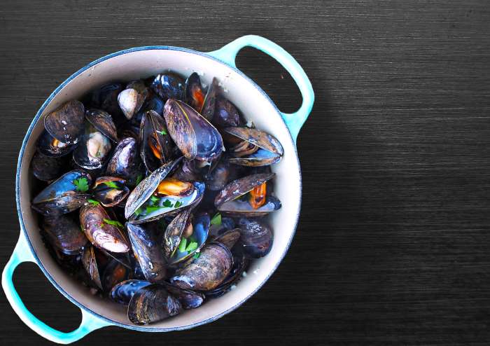 Školjke temeljito očistite, odprte in poškodovane zavrzite. Por očistite in narežite na kolesca, česen olupite in strite oz. sesekljajte.