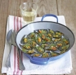 S penovko poberite školjke in zelenjavo iz lonca, jih prestavite v večjo skledo in pokrijte, da ostanejo tople. V lonec dodajte limonin sok, omako zavrite in pustite vreti, da tekočina povre na polovico. Po okusu solite in poprajte ter prelijte čez školjke. Potresite jih s peteršiljem in ponudite s svežim kruhom.