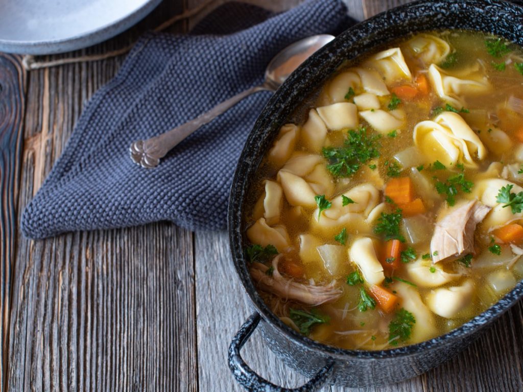 0,5 kg piščančjega mesa s kostmi 1 čebula 2 stroka česna 2 do 3 korenčki 1 koleraba 1 korenina peteršilja 1 steblo zelene sol, poper, lovor, majaron, timijan sveži peteršilj olje, kis 1,5 l jušne osnove