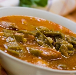 V večjem loncu segrejemo olje, na katerem med občasnim mešanjem pražimo čebulo 5 minut, da postekleni. Dodamo na kocke narezano meso. Meso na hitro, med stalnim mešanjem, popečemo z vseh strani. Dodamo paradižnik in česen, dušimo 15 minut, nato pa primešamo še stročji fižol. Zalijemo z jušno osnovo, solimo in popramo ter pokrito na zmernem ognju kuhamo še 20 do 30 minut oziroma toliko časa, da se fižol zmehča.