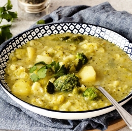 2 srednje velika krompirja (300 g) 200 g brokolija (1/2 manjše glave) 1/2 srednje velike čebule (50 g) 2 čajni žlički olivnega olja 1 čajna žlička česna v prahu 1/3 čajne žličke šatraja 1/3 čajne žličke timijana 1/2 zelenjavne jušne kocke 3 1/2 dl vode 1 jedilna žlica kvasovih kosmičev sol poper