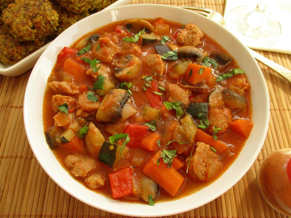 150g Sojino meso Mleta rdeča paprika Sojina omaka Sol Olje - sončnično Gorčična semena 1 kos Čebula 20g Pšenična bela moka 2 kosa Krompir 1 kos Korenje 2 kosa Paradižnik - svež Poper Lovorov list Sladkor - beli 1 strok Česen