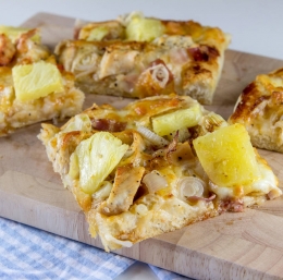 2 stroka Česen 2 žlici Olje - olivno 300g Piščančje prsi Sol Poper 2 žlici Omaka - žar 100g Mocarela Ananas - svež 4 rezine Slanina 0,5 kosi Čebula