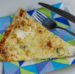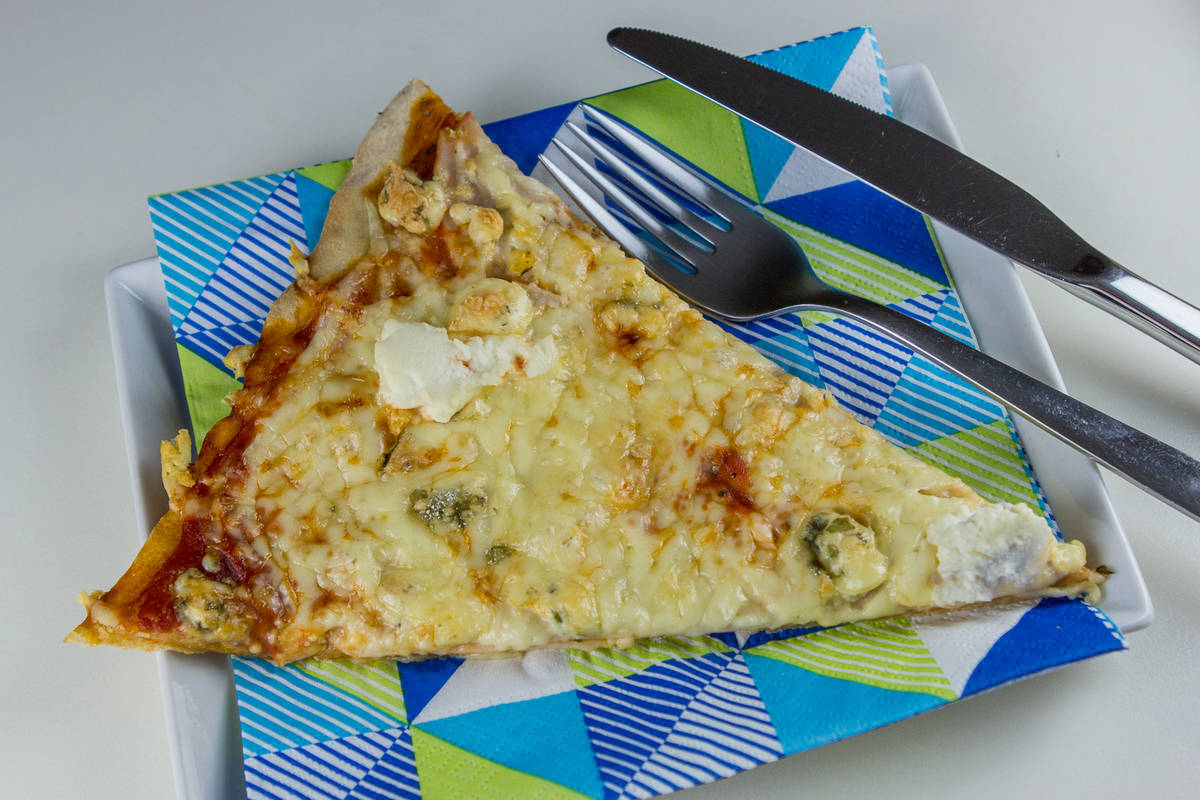 250g Pšenična bela moka 20g Kvas - svež 1 čajna žlička Sladkor - beli Sol Olje - olivno Paradižnik - mezga Origano Prsi - puranje (salama) Sir - gavda Gorgonzola Sir - ricotta