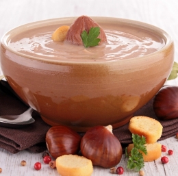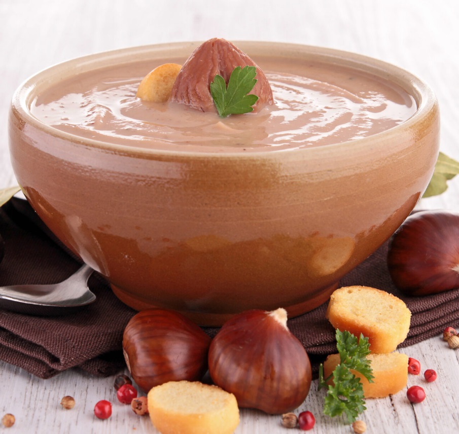 Prihranjene štiri kostanje na maslu pretresemo. Preden juho ponudimo, jo po želji še malo začinimo s soljo in poprom ter okrasimo s kostanjevimi rezinicami.