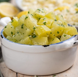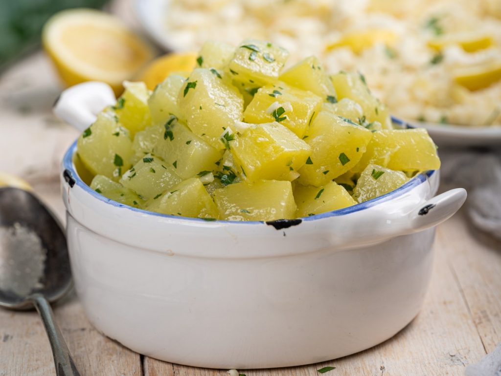 3. Ko so koščki kuhani, jih stresemo v cedilo in splaknemo s hladno vodo, da ustavimo kuhanje in jih ohladimo za solatko.