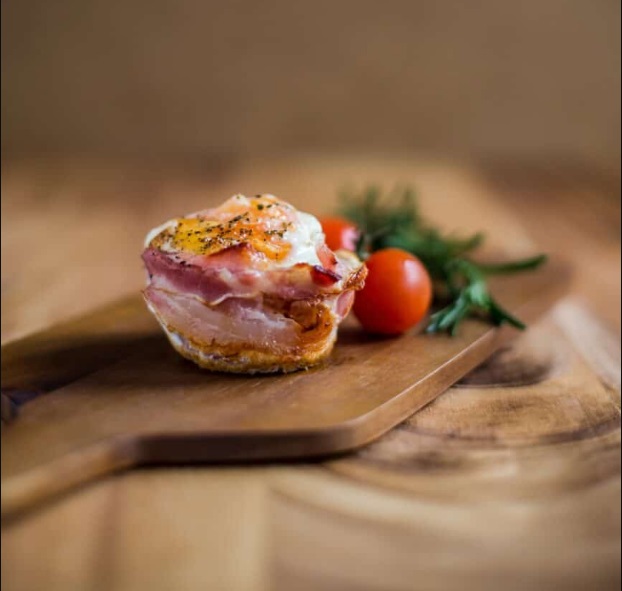 Pečico segrejte na 190 °C. Namastite šest lukenj v pekaču za mafine. Šest kolobarjev slanine prerežite na pol. Z razpolovljenimi rezinami slanine obložite dno luknjic, tako da se rahlo prekrivajo. S preostalimi koščki slanine obložite stranice luknjic.