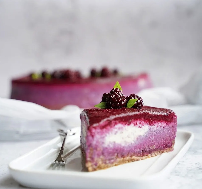 3. Za kremo indijske oreščke noč prej namočimo v zadostni količini hladne vode. Naslednji dan jih odcedimo in speremo pod tekočo vodo. V mešalniku jih z 1 dcl vode zmiksamo v gladko pasto. Damo jih v posodo, dodamo kokosovo smetano (strjeno kremo na vrhu ohlajene pločevinke kokosovega mleka) in zmešamo. Dodamo še sladilo po izbiri in stopljeno kokosovo olje. Na koncu v maso narahlo vmešamo še tretjino robidove marmelade in prelijemo po tortni podlagi. Za nekaj časa jo postavimo v zamrzovalnik, da se strdi. Ko je dovolj trda, čeznjo prelijemo še zadnjo tretjino robidove marmelade.