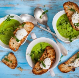3. Dodamo smetano in po okusu začinimo. Kuhamo še 5 minut, nato s paličnim mešalnikom vse zmiksamo v gladko, kremno juho. Razdelimo na krožnike in dodamo popečeno slanino. Če želite, lahko dodate malo kisle smetane in sesekljanih svežih zelišč ali peteršilja za okras. Izvrstno se prileže tudi meta, a je morate dodati malo, ker ima tako močno aromo. Popečeni kruhki s kozjim sirom