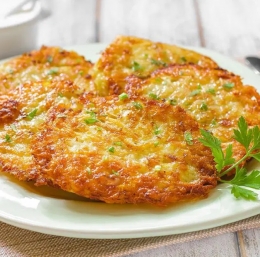 3 Na ponvi segrejemo nekaj žlic olja. Na zmerni temperaturi pečemo naše palačinke. Na ponev damo dve žlici krompirjeve zmesi, malo sploščimo palačinke in pečemo 5 minut, obrnemo in še 4-5 minut, do lepe zlato rumene barve.