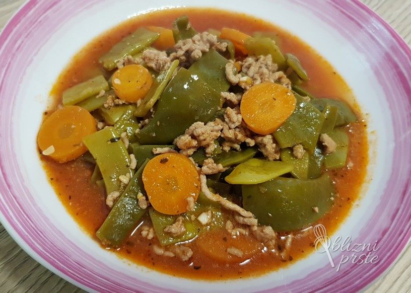 500 g stročjega fižola 500 g mešanega mletega mesa 2 čebuli 2 večja paradižnika ali 350 g pelatov 2 večja korenčka 4 stroki česna 2 lovorjeva lista 1/2 žličke timijana 1 jušna žlica sladke mlete paprike poper 1 liter jušne osnove 2 žlici oljčnega olja