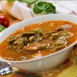 3 Vse skupaj prelijemo z jušno osnovo in dodamo fižol. Začinimo z vsemi začimbami in kuhamo približno pol ure.